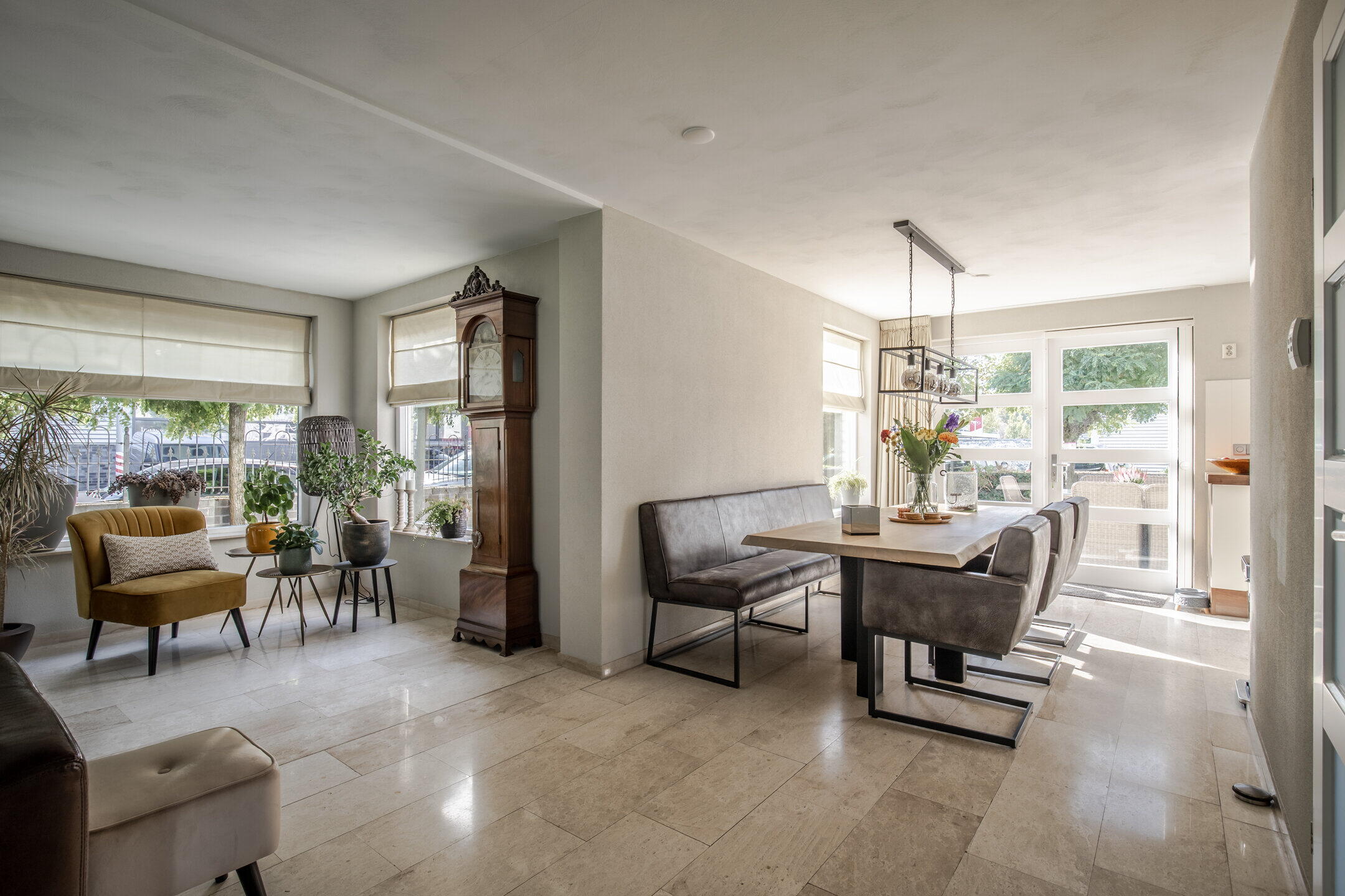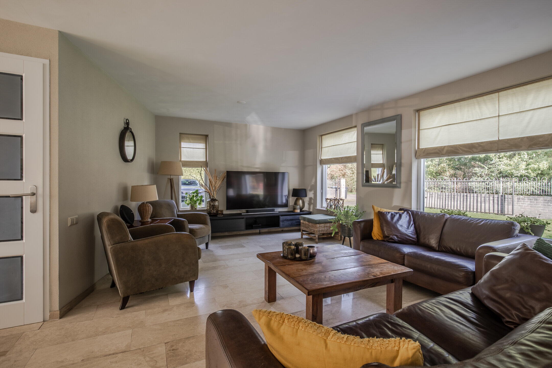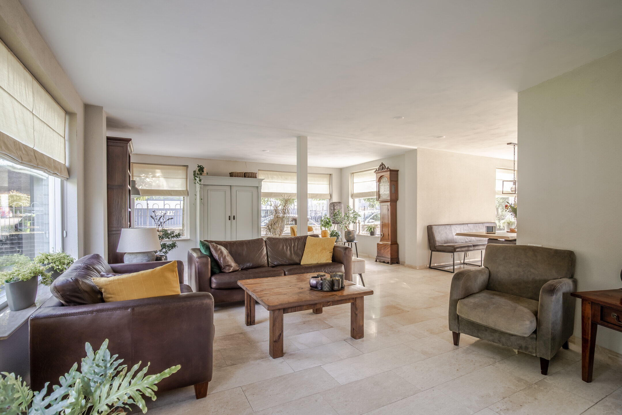 Entree van de woning in de hal. De hal voorziet u in het toilet met fontein, de trapopgang en de entree naar de kantoorruimtes en de woonruimte. De woonruimte bestaat uit een royale living waarvan het zitgedeelte aan de voorzijde is. De royale uitbouw aan de zijgevel geeft een heerlijke toevoeging aan de woonkamer en in het verlengde is de leef keuken met ruime voor de eethoek. Aansluitend is de open keuken opgesteld in een U-vormig blok voorzien van alle inbouwapparatuur. Vanuit de keuken zijn er openslaande deuren naar het zonnige terras welke is voorzien van een elektrisch zonnescherm.
