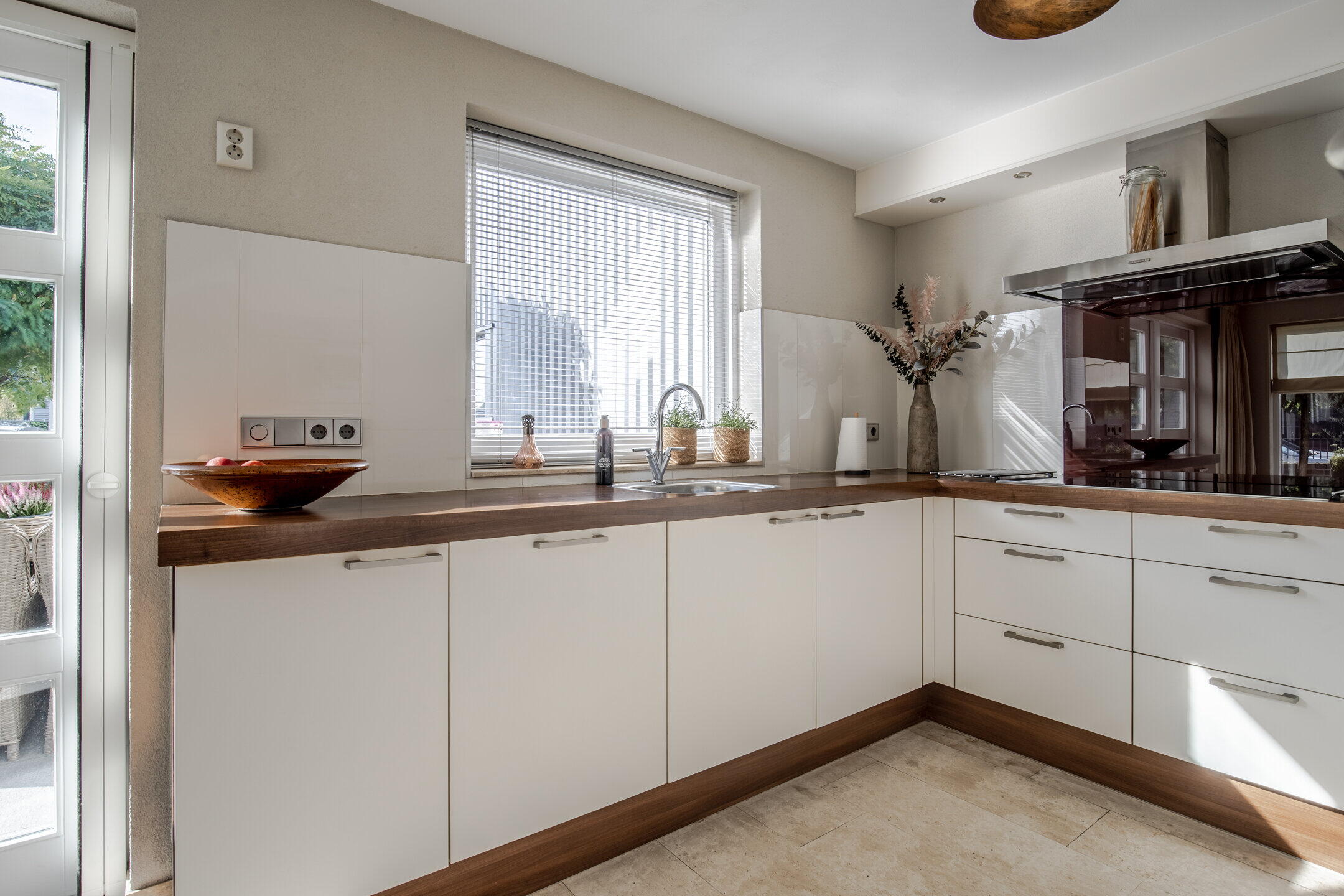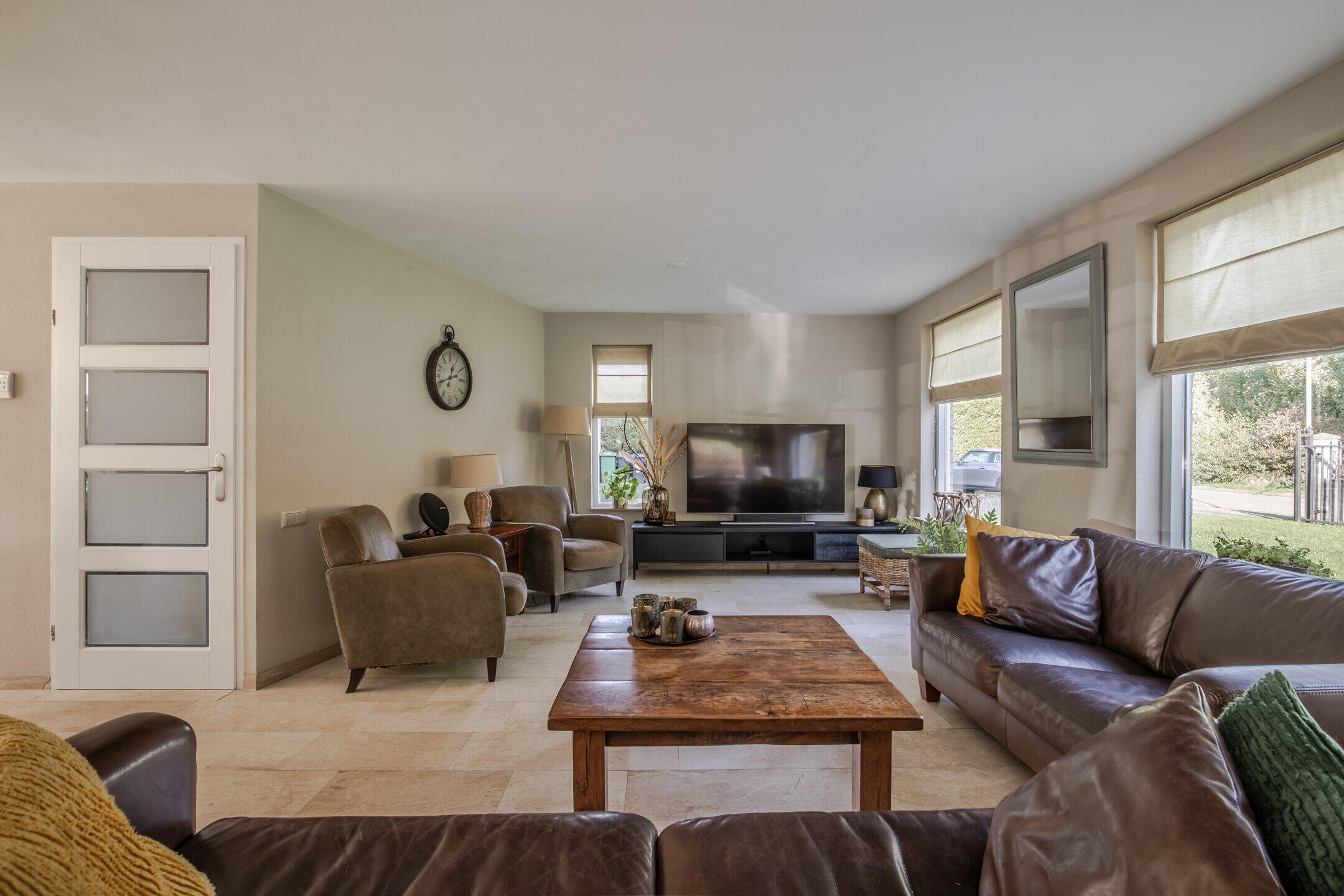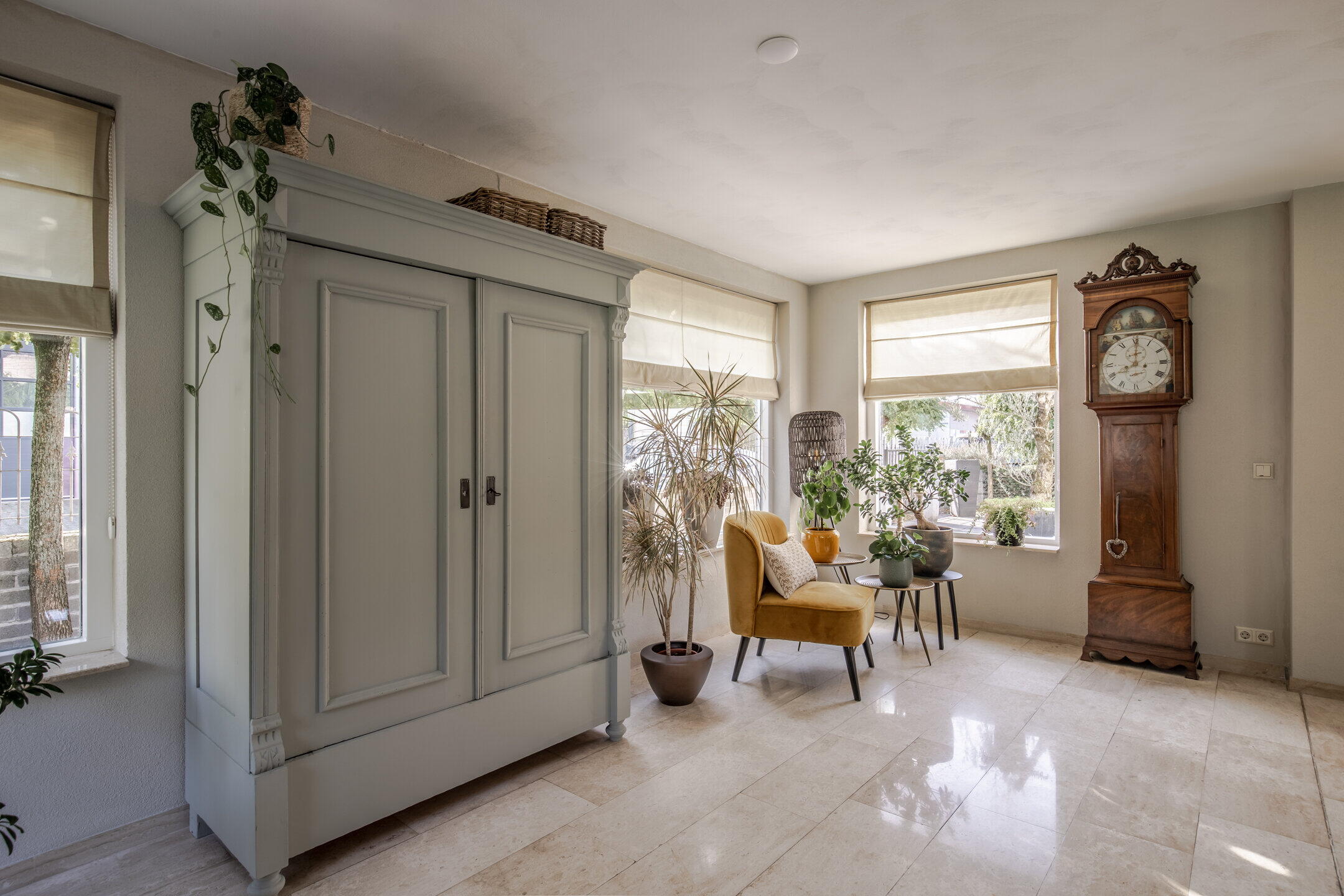 Entree van de woning in de hal. De hal voorziet u in het toilet met fontein, de trapopgang en de entree naar de kantoorruimtes en de woonruimte. De woonruimte bestaat uit een royale living waarvan het zitgedeelte aan de voorzijde is. De royale uitbouw aan de zijgevel geeft een heerlijke toevoeging aan de woonkamer en in het verlengde is de leef keuken met ruime voor de eethoek. Aansluitend is de open keuken opgesteld in een U-vormig blok voorzien van alle inbouwapparatuur. Vanuit de keuken zijn er openslaande deuren naar het zonnige terras welke is voorzien van een elektrisch zonnescherm.